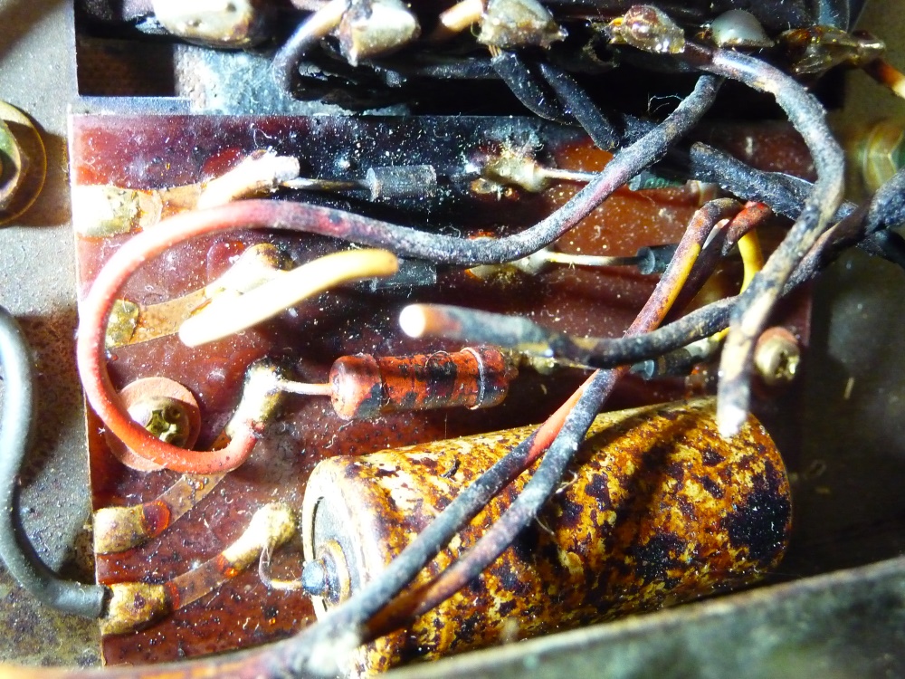 La construction est sérieuse, avec 4 EL34 en sortie, mais l'âge faisant une visite d'inspection aurait sans doute permis d'épargner cette panne gravissime à l'engin. Il semble que l'une des EL34 soit en cause (une résistance a fortement chauffé) , entraînant un débit anormal au primaire sur secteur. Le porte-fusible ayant disparu, l'on peut se douter que le remplacement du dispositif de protection a été fait de manière disons, fantaisiste...