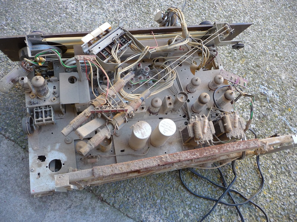 Le châssis été extrait de son meuble, avec sa poussière de 60 années...  En excellent état, le poste serait fonctionnel. Nous nous garderons bien de vérifier, surtout au vu des condensateurs haute-tension . Un remplacement discret, par en dessous, sans extraction des originaux, permet de préserver le transformateur d'alimentation et sa valve EZ81.