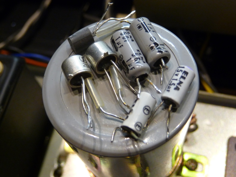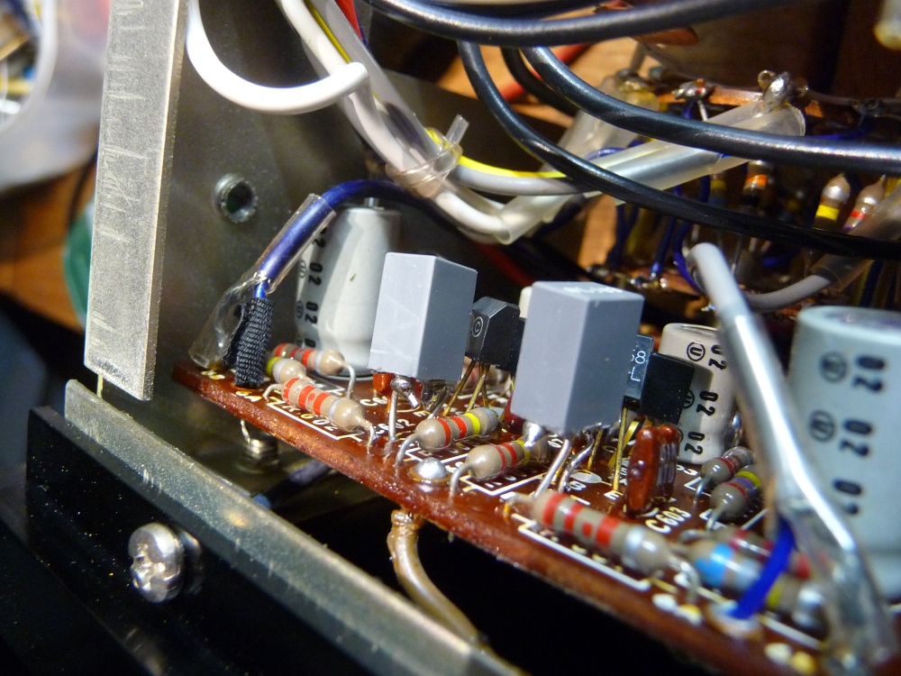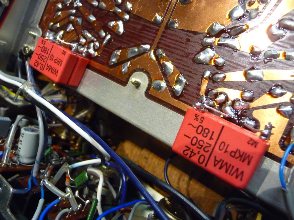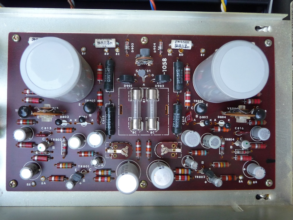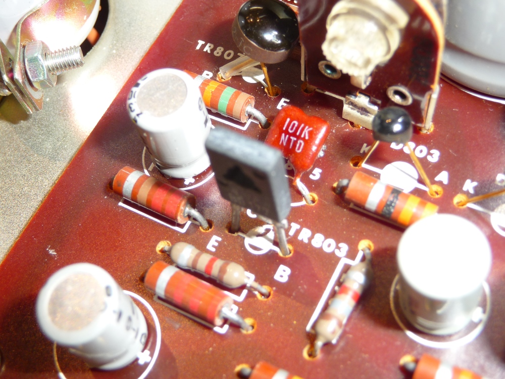 On commence par supprimer le thyristor de "protection" qui est à l'origine de bien des problèmes, ce système que Sansui, d'ailleurs, supprimera de toutes ses productions. Mais la panne persiste : bruits, distorsions, et pour cause, ce sont les deux transistors du Vas qui ont mal vieilli et qui bloquent en partie l'étage de sortie. La substitution par des BD bien plus modernes rétablit le fonctionnement équilibré. Puisque l'appareil est ouvert, on en profite pour remplacer les capas chimiques des entrées PHONO et AMPLI par des films plastiques bien plus fiables (en courants de fuite).