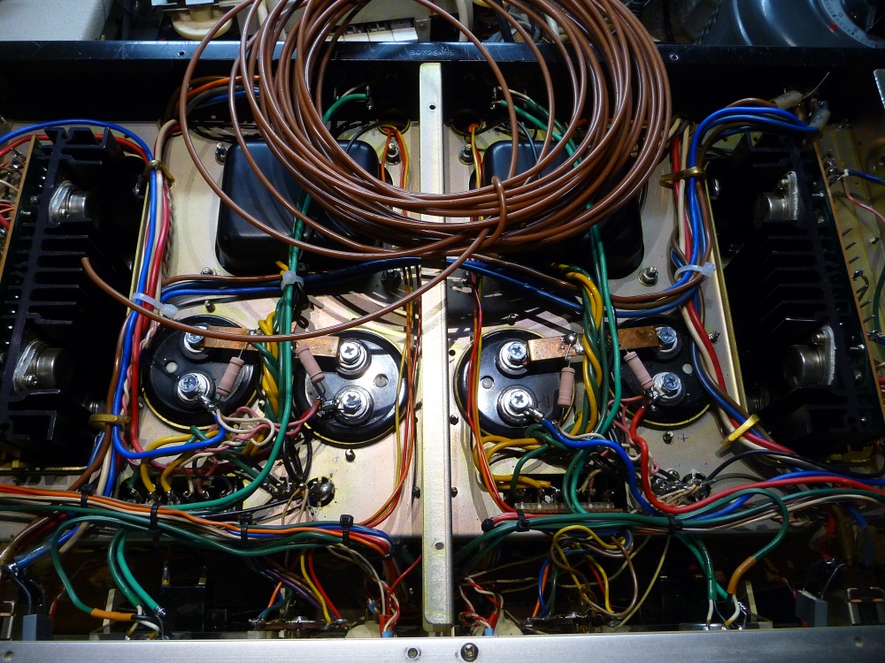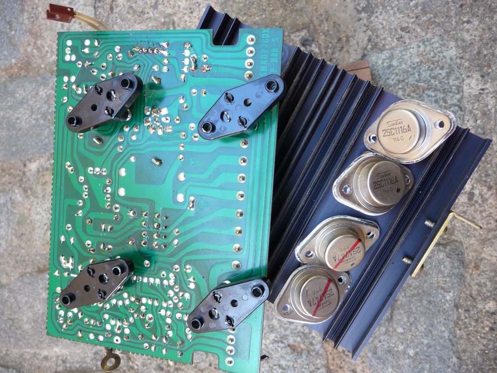 Et surprise, encore le maudit 2SA798 en entrée de chaque voie de puissance !  La panne est donc vite identifiée, encore faut-il parvenir à les extraire: Démontage intégral de chaque module, décapage des relais (qui en ont vu des flammes), remplacement de quelques résistances un peu sous-calibrées (l'appareil fonctionne sous + et - 55 volts...), et remontage.  Un apport sérieux de cuivre complète la réinstallation.