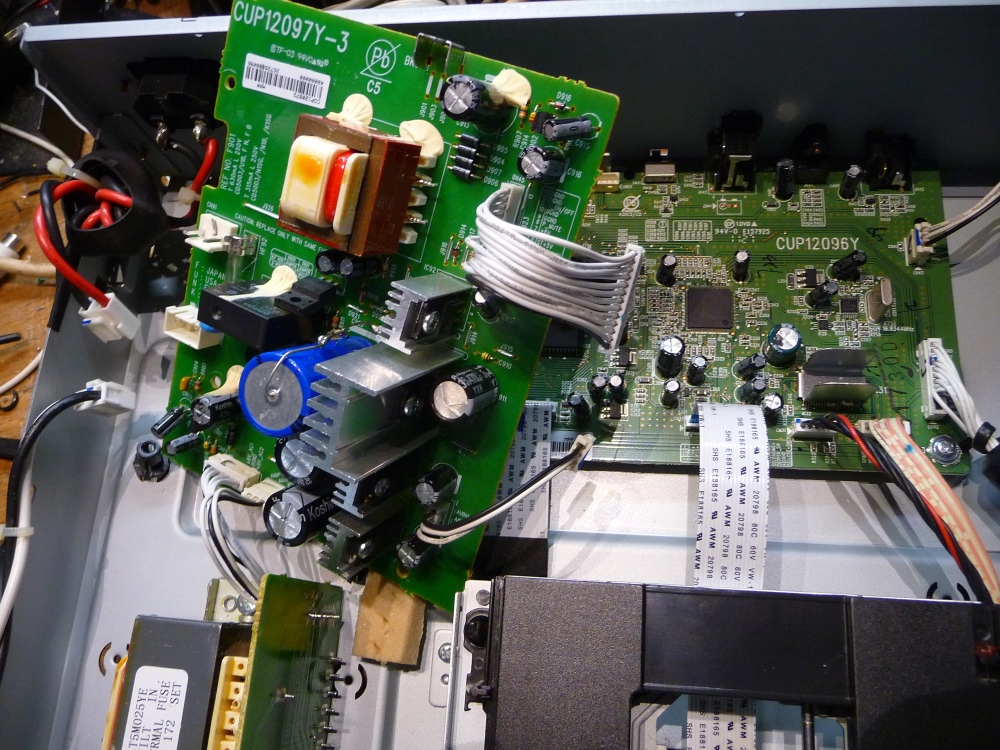 Déjà en panne ! Pourtant récent, marqué Marantz, mais fabriqué en Chine avec le sceau de l'obsolescence programmée...  A nouveau c'est l'alimentation qui pêche par l'improvisation de sa conception, ce qui accélère le vieillissement du condensateur principal : Le composant remplacé - le condensateur de couleur bleue (BC Components) - se trouve situé à proximité du régulateur principal (tension de 8V) , au plus proche du dissipateur en aluminium, idéal pour une cuisson à petit feu qu rend l'appareil incapable de s'initialiser .