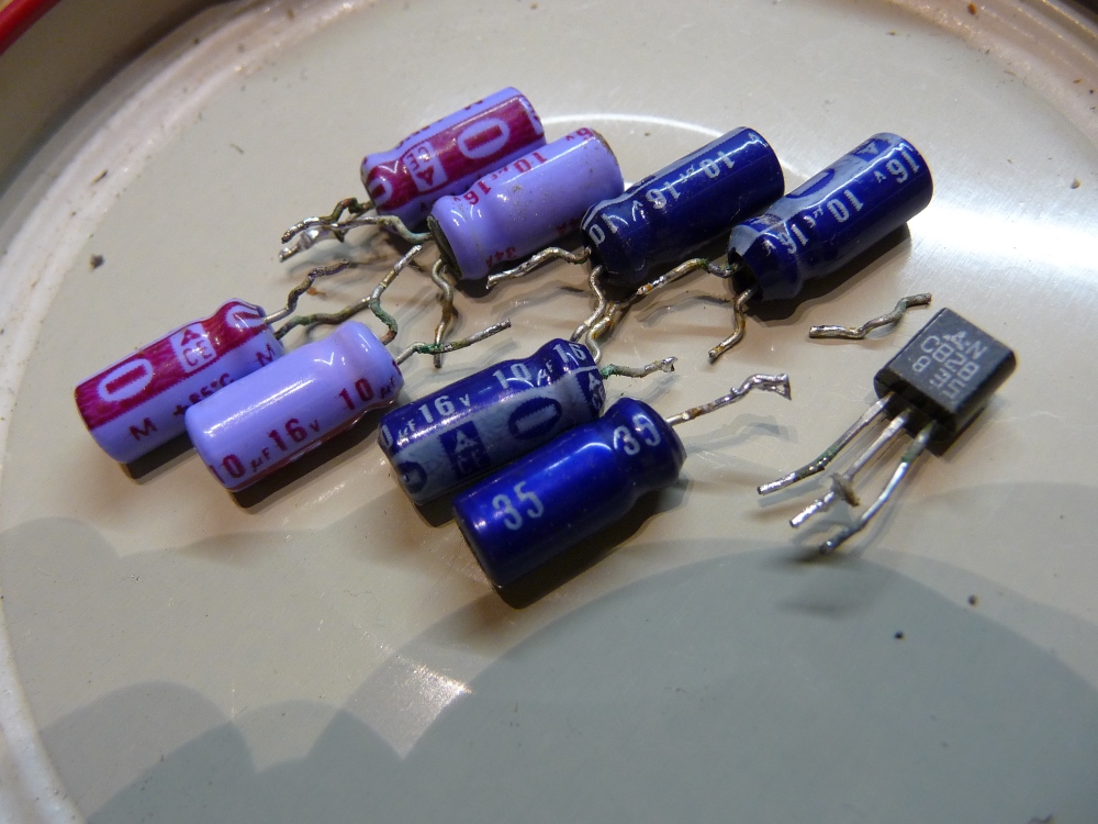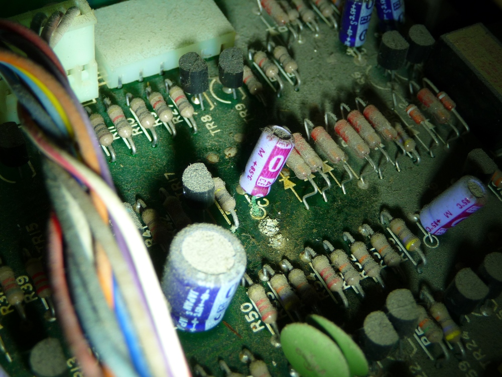 Prise dans la façade la carte correspondante est indémontable, il faut donc se résoudre à intervenir dessus depuis l'arrière, à condition d'avoir déposé tous les périphériques s'y raccordant. On regrette alors la conception modulaire des REVOX. Et une nouvelle série de condensateurs attaqués apparaît. Un transistor situé au voisinage immédiat sera préventivement remplacé.