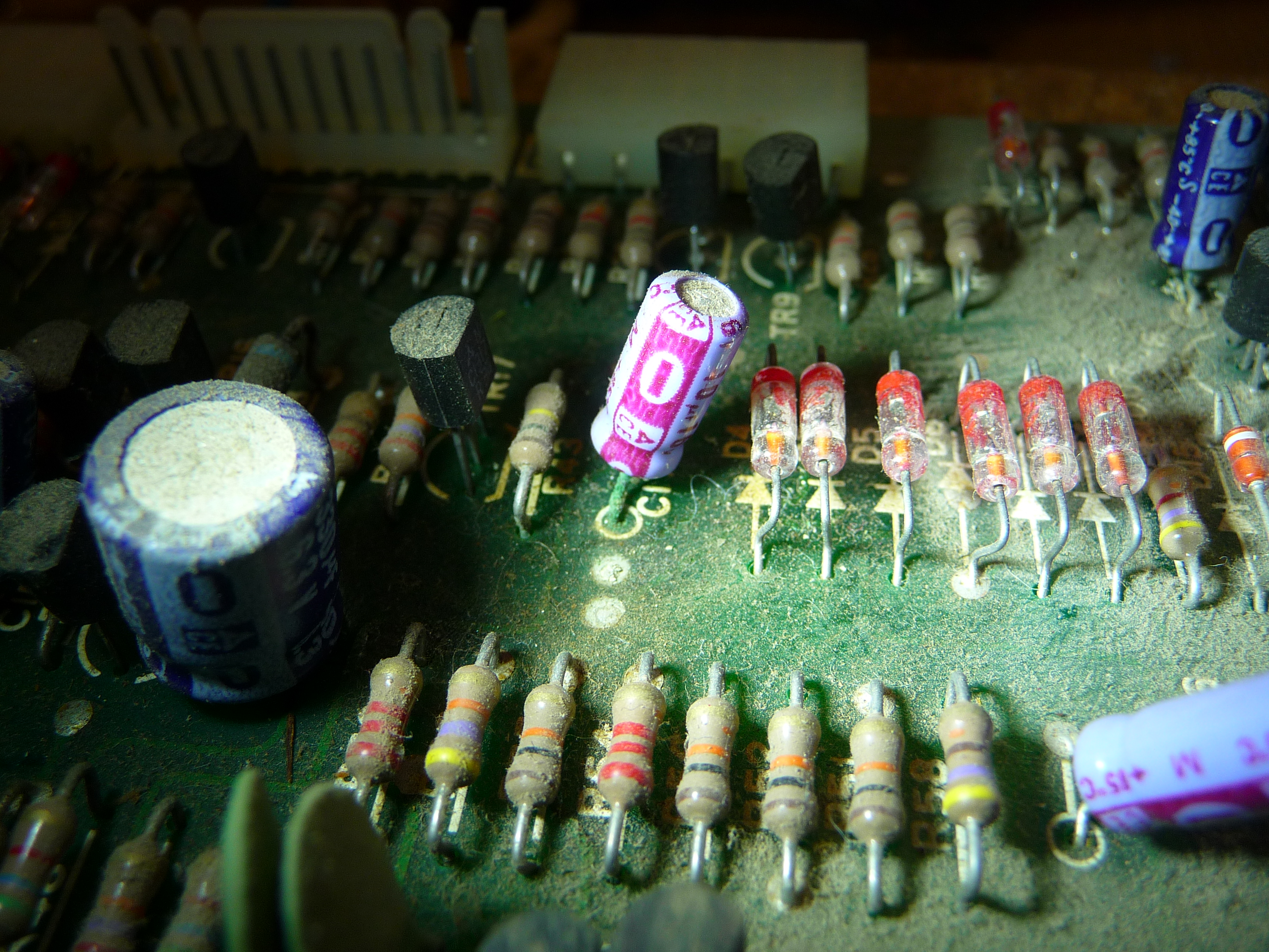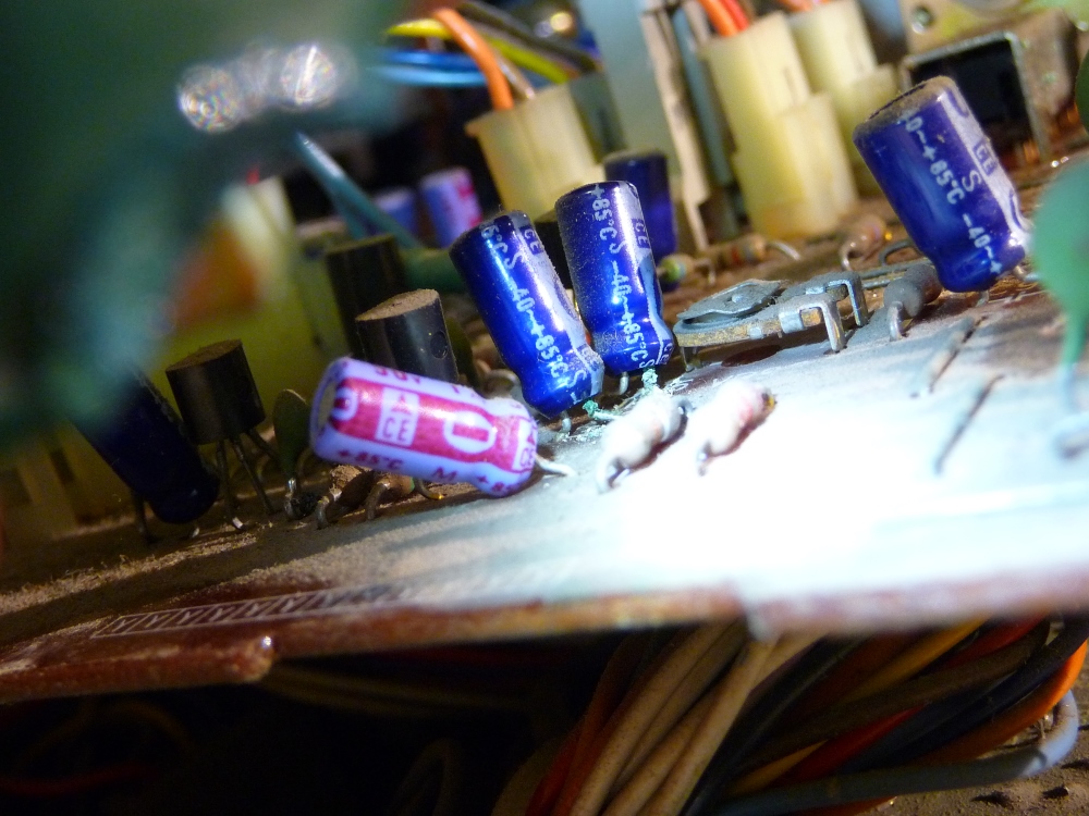Celui-ci est arrivé en raison d'une instabilité du défilement en mode ... pilotage par quartz , c'est-à-dire dans la configuration la plus stable ! A l'ouverture du capot arrière, un détail troublant retient notre attention, malgré la poussière accumulée depuis des décennies : un condensateur chimique est fortement attaqué au vert de gris , au point que deux soudures voisines de traversée - carte en double face - ont également pris un aspect douteux. Placés sur la carte de clavier, (verticale , à gauche) l'extraction- remplacement est relativement facile mais d'autres composants présentent le même défaut. Ce qui est curieux, c'est qu'il s"agit toujours de condensateurs de la même valeur de 10uF/16V, pas des 22, ou des 47, ou des 2,2, non uniquement les 10uF. L'étude du schéma montre que la même valeur est également présente à tous les étages de la boucle d'asservissement de la régulation de vitesse.
