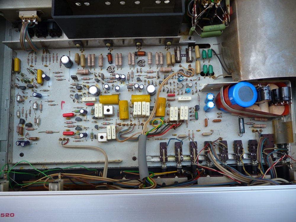 Un "recapage", ou remplacement intégral de tous les condensateurs chimiques, est plus qu'indispensable. Une résistance shunt d'alimentation des ampoules de façade est également sérieusement fatiguée. La fiche DIN de l'entrée PHONO sera également ressoudée à neuf (mauvais contacts).