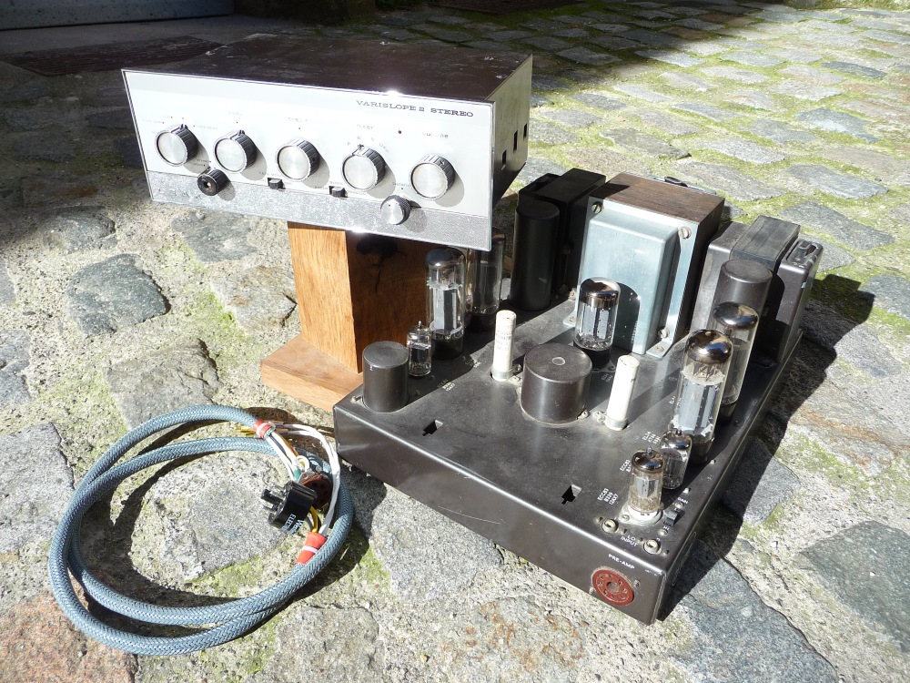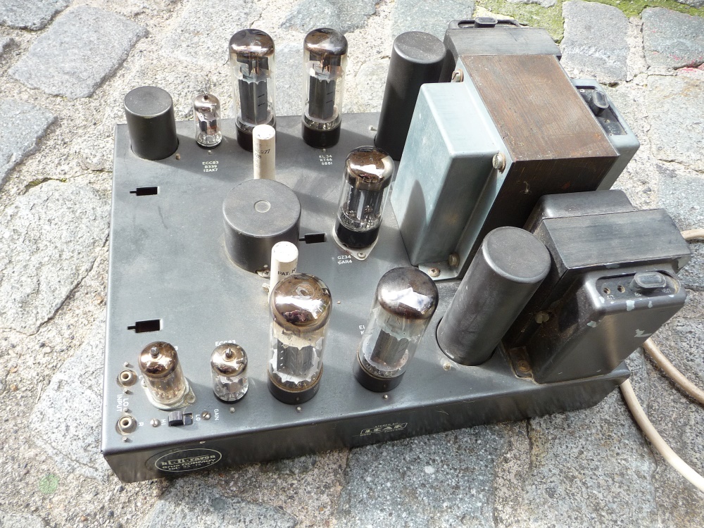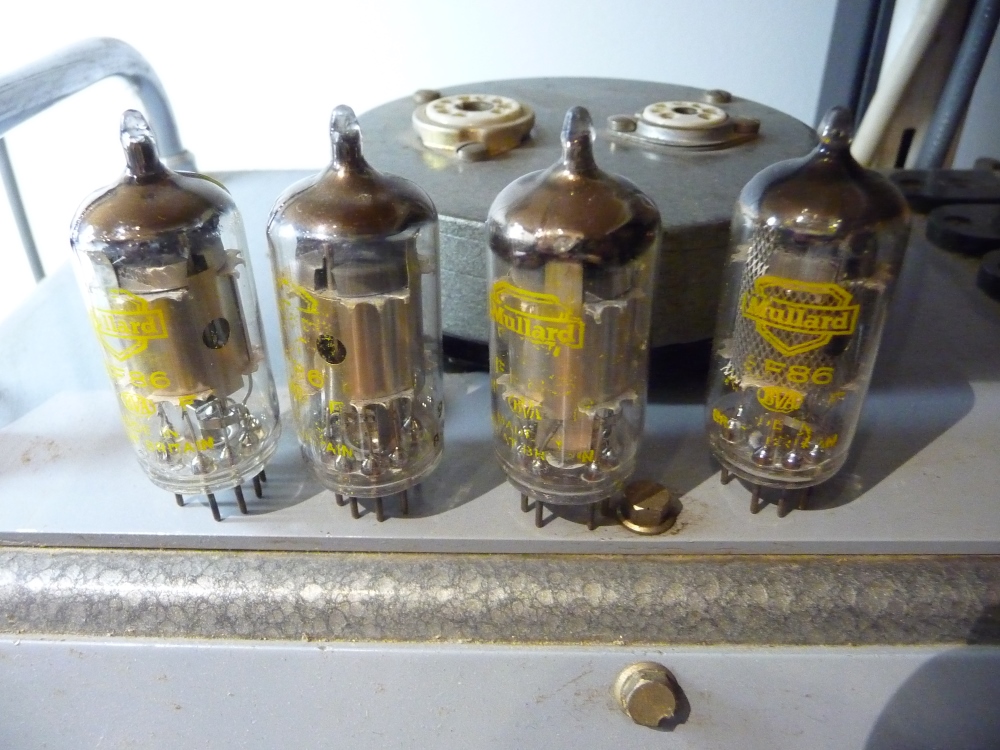 analyseur de tubes. Fort heureusement, à part un ergot détrompeur cassé, les tubes de sorties - les plus coûteux - se révèlent en très bon état, et pour trois d'entre eux, sans doute d'origine! La valve redresseuse n'est pas neuve, un peu fatiguée, mais est encore à même d'atteindre 360V (petite perte de puissance). Un remplacement sera quand même à envisager . Les quatre EF 86 du préampli se révèlent également en très bon état, estampillées MULLARD (mais production Philips) , en tous cas, d'origine . Il manque deux des trois ECC83, nous en fournirons une paire de chez RCA , occasions testées bien sûr.
