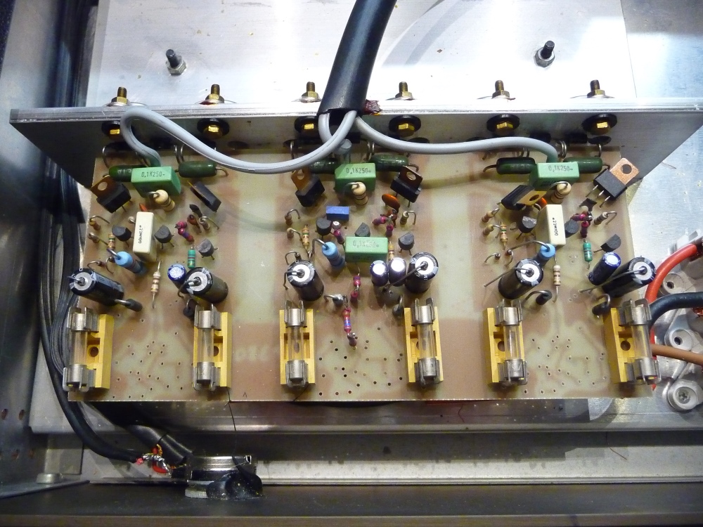 La construction est spartiate, assez facile d'accès pour les amplis de sortie, mais c'est beaucoup plus acrobatique pour le préampli dont les LEDs bicolores compliquent le câblage . Tous les transistors (MOTOROLA essentiellement) sont testés, tandis que les condensateurs tantale goutte sont évacués. Le voyant MARCHE (brûlé) est également rénové au profit d'une LED de couleur bleue compatible avec perçage originel. La voie "grave" à sommation D&G et niveau réglable apparaît comme  un filtre actif de puissance de pente 18dB/octave centré environ autour de 150Hz, tandis que les voies D & G fonctionnent en passe-haut à partir de cette fréquence.