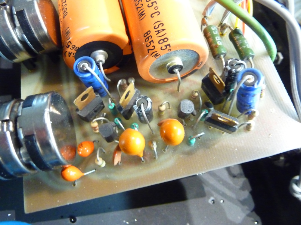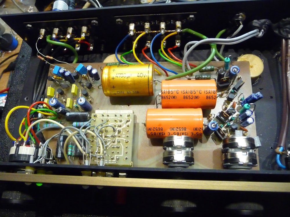 En ce qui concerne le préampli, un module PHONO RIAA est suivi des commandes sélecteur d'entrée puis tape monitor, avant d'attaquer un petit ampli de ligne -buffer. A nouveau, le remplacement de condensateurs tantale par des électrochimiques et des films plastique ainsi que quelques résistances critiques par des films métalliques de précision rétablit un fonctionnement silencieux et .... durable !