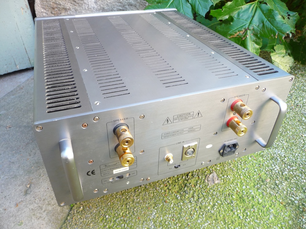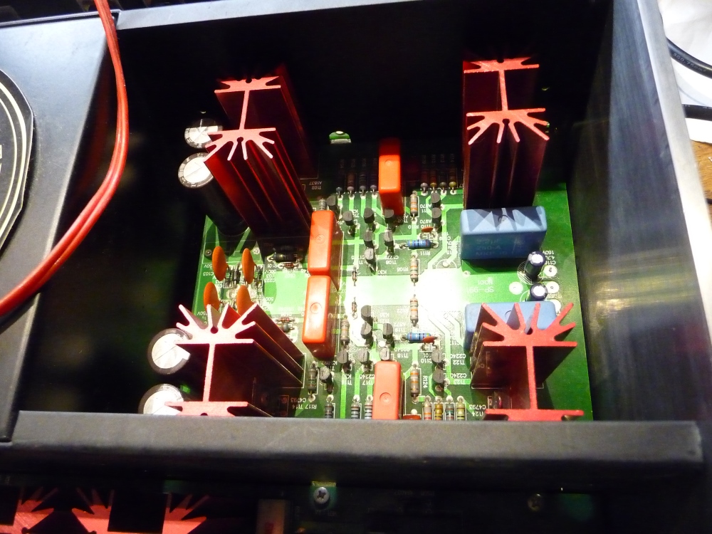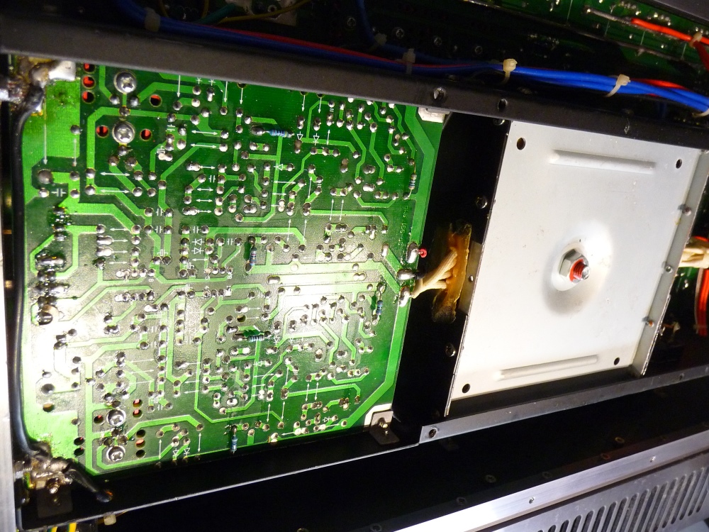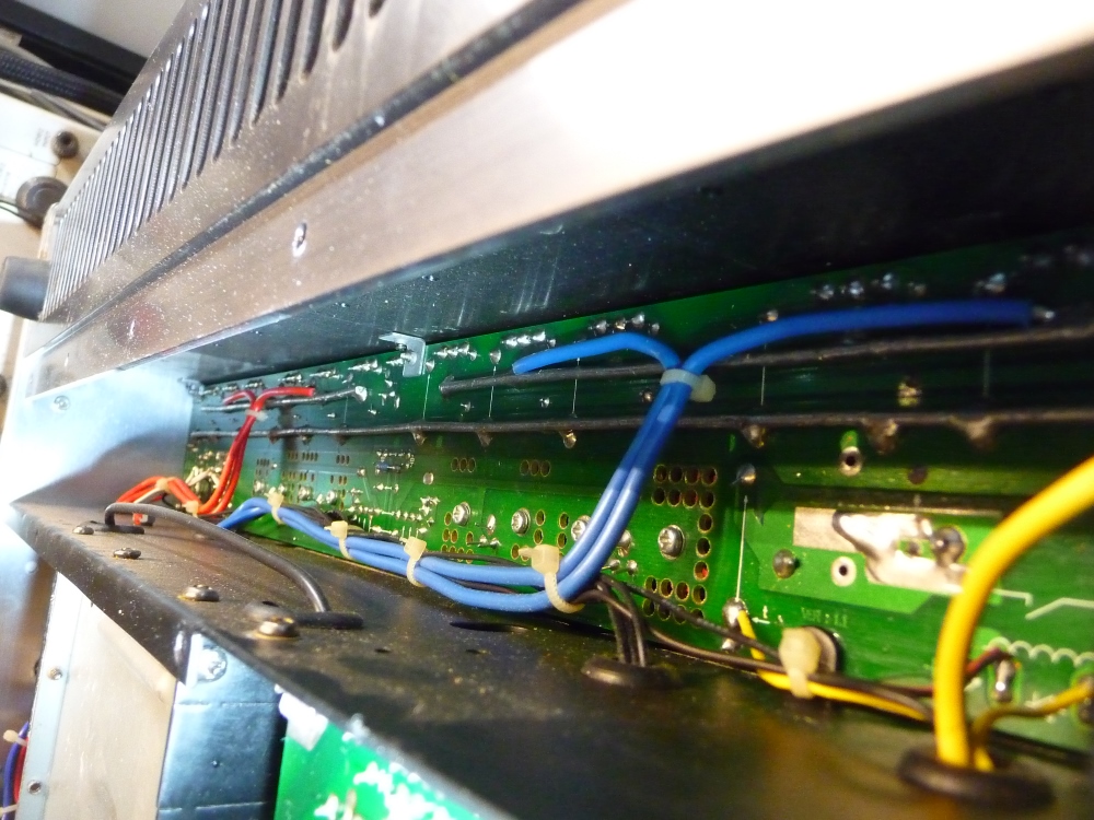 Lourds comme des enclumes, avec près de 35Kg , et donc difficiles à déplacer, ces appareils ne sont pas évidents à dépanner, surtout du fait de leur mécanique complexe à désassembler.On commence par retirer les couvercles (déjà 24 vis) , une partie de l'intérieur apparaît . Mais pas tout , les étages entrée et régulation entrée sont superposés et ne permettent d'accéder qu'à une face seulement des cartes. IL faut donc retirer le panneau arrière, ce qui est d'autant moins évident que les borniers (100A de capacité ?) sont soudés sur des sections de cuivre assez inhabituelles. Le symptôme annoncé justifiant cette opération est "manque de gain sur une voie"...