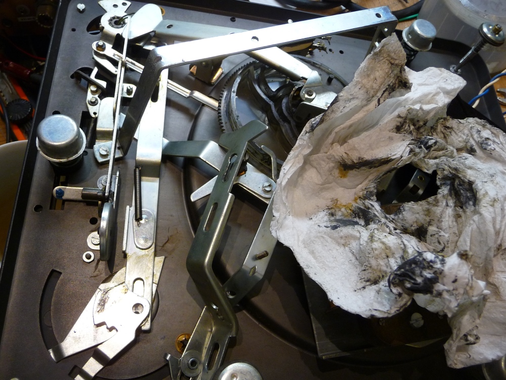 Datant de 1967, ce pick-up stéréo à tubes , avait déjà fait l'objet d'une révision partielle. La panne de l'automatisme est l'occasion de réaliser une révision complète, cette fois, à la fois de la platine, mais surtout de l'amplificateur au bord de tomber à nouveau en panne. Un démontage intégral s'impose, la robustesse de la mécanique n'est pas en cause, les lubrifiants sont juste archi-secs.