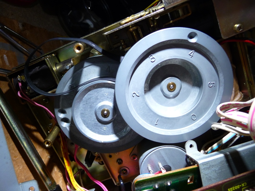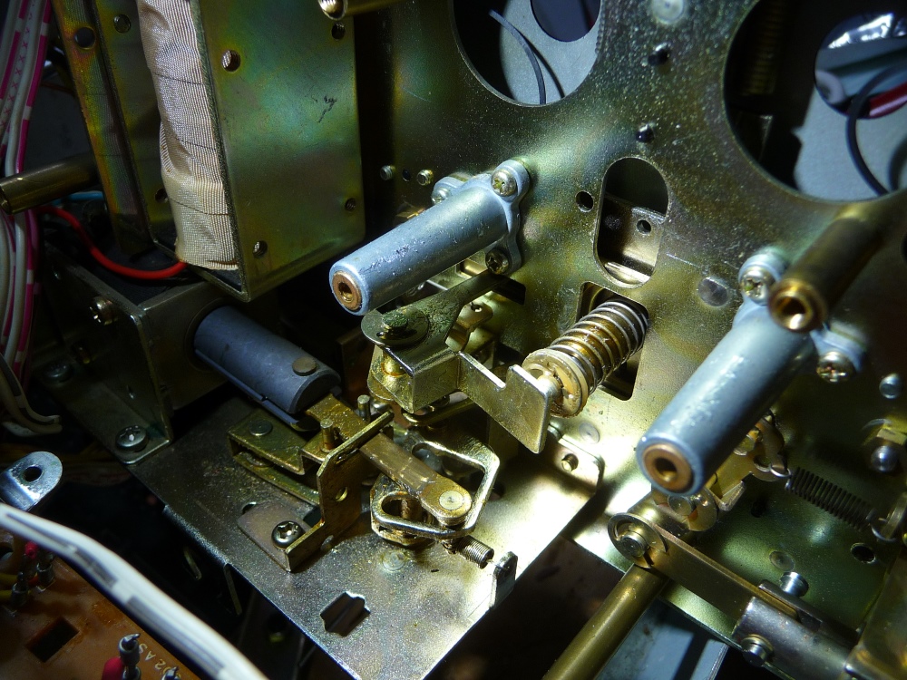 L'extraction de la platine mécanique permet la dépose des cabestans et leur nettoyage approfondi, comme pour toutes les glissières fortement emplâtrées de graisse durcie. Le remplacement de la courroie principale et de l'entraînement du compteur sont ensuite effectués.