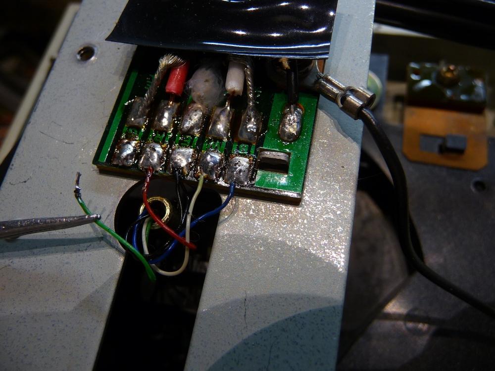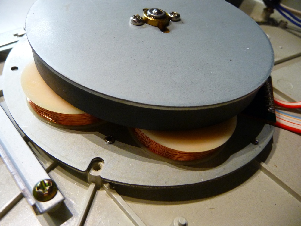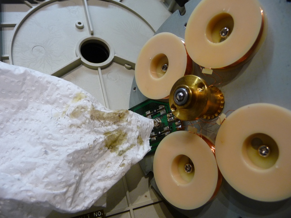 Démontage du moteur-pivot, lubrification, , remplacement du condensateur principal d'alimentation-entraînement, rafraîchissement des soudures de transition du signal bras-câble de raccordement et le Phase Locked Loop redémarre ...