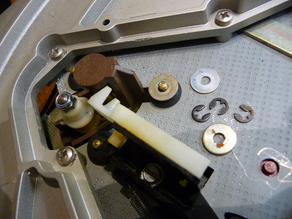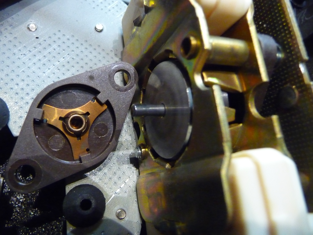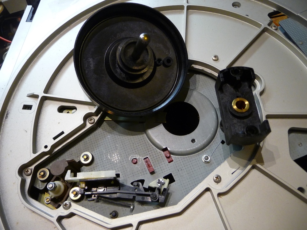 Tout est remis en route hormis le réglage fin  de vitesse (pitch) totalement hors service : une courroie crantée agit sur un écarteur du pignon moteur modifiant ainsi le rapport réducteur de l'entraînement ... solution inédite mais inutile finalement si l'on prérègle correctement la bague  sans plus avoir à y toucher ! (contrôle stroboscopique à l'appui).