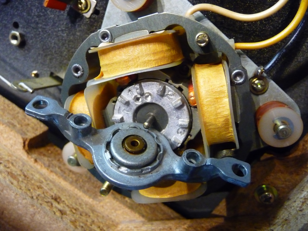 Totalement bloquée. Un cas jamais rencontré. Le pivot est quasiment immobilisé, très difficile à manoeuvrer . Il faut tout mettre à plat à l'issue d'une infiltration à l'acétone. L'huile a durci, séché, chargée en limaille, mais c'est surtout la bille de la base qui s'est oxydée au contact du palier en bronze. Le moteur nécessite également une lubrification à neuf, tout comme l'ensemble de l'automatisme figé dans une gangue de graisse que l'acétone seule parvient à dissoudre.
