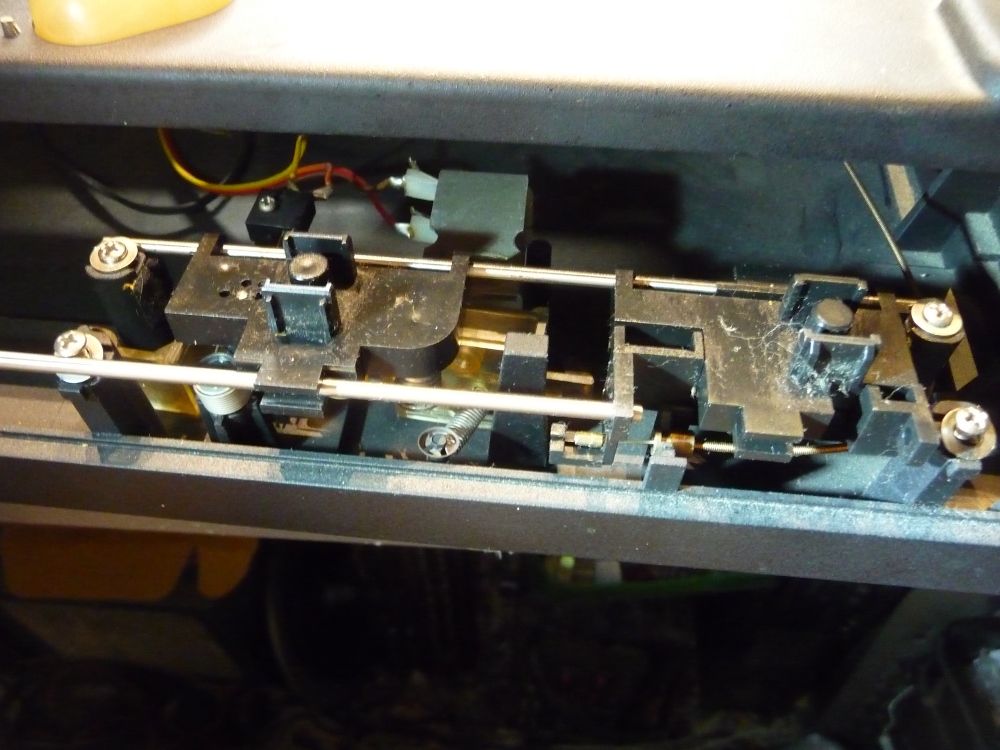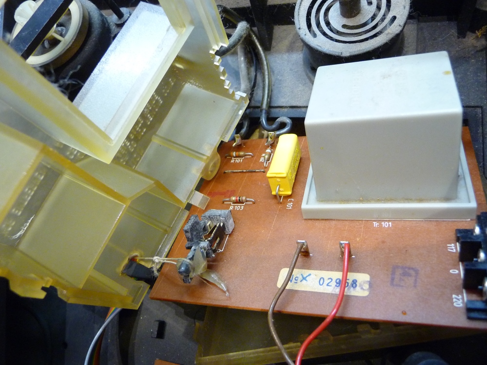 On commence par vérifier - avant toute chose - qu'un condensateur RIFA n'a pas été installé dans l'antiparasites de l'interrupteur secteur. Puis c'est au tour de l'alimentation du moteur de voir son condensateur principal remplacé (daté de 1979...). Toute la mécanique du clavier sera ensuite débarrassée des lubrifiants durcis, noircis qui entravent la souplesse des mouvements. La cordelette d'actionnement de l'interrupteur sera retendue, tout comme le contacteur sélecteur 33/45 t/mn.
