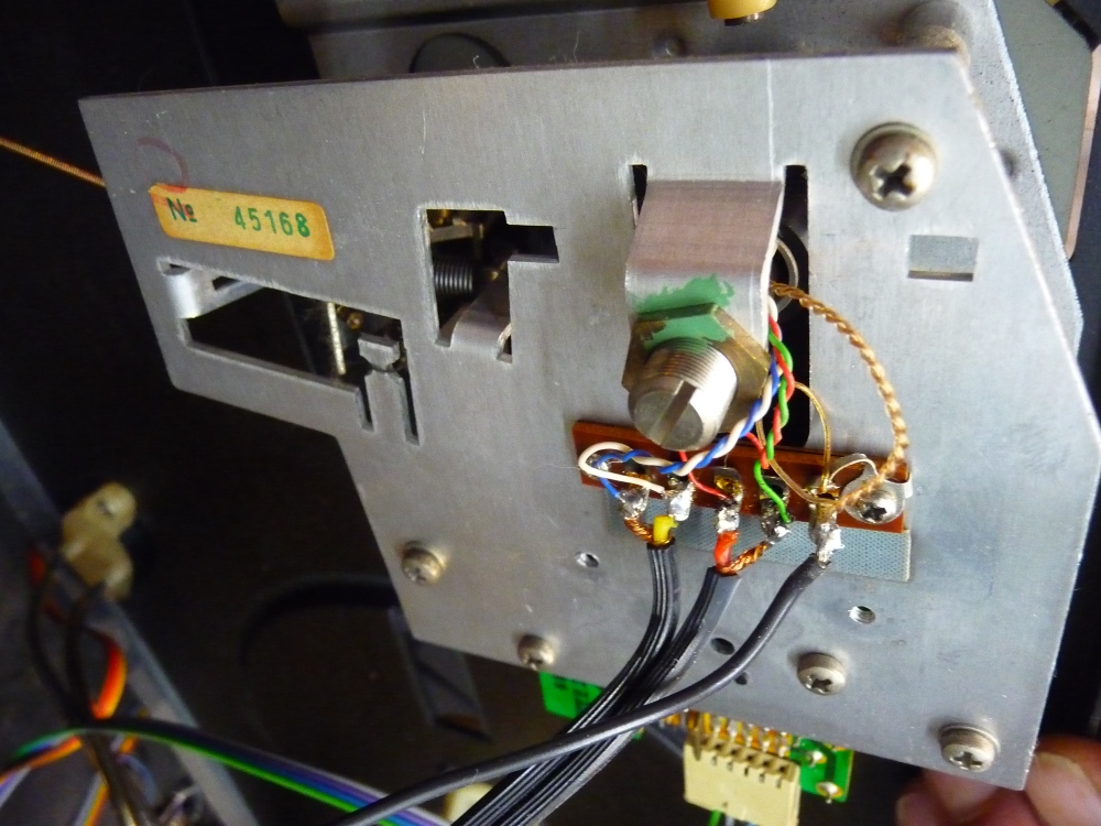 Le câble des sorties du signal présente également de lourdes marques d'oxydation sur les fiches cinch/RCA serties , Des soudures ont été refaites... allez, un beau câble neuf en CuAg/PTFE avec fiches neuves remettra tout en ordre de marche . Remontage, repositionnement du pivot huilé de frais, et elle démarre , ultime tarage des deux ajustables des vitesses et les raies  stroboscopiques sont stables.