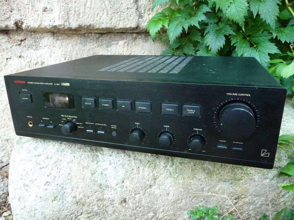 Production tardive de ce constructeur japonais bien connu, le A384 demeure d'une conception bien classique, à cette exception près qu'il intègre un étage à tube électronique: Une double triode ECC82 / 12AU7 est incorporée en étage buffer ( à gain nul ), dans le trajet du signal. L'exemplaire présente des discontinuités en sortie, avec une forte distorsion à faible puissance.