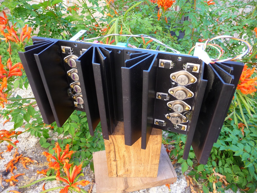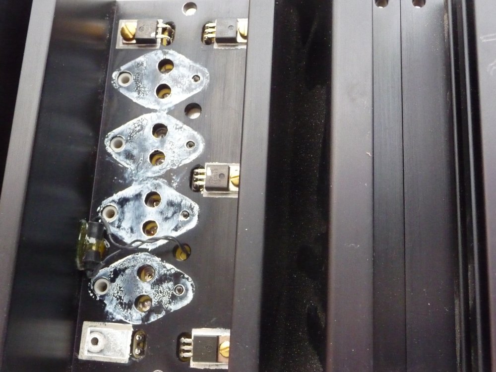 Celui-ci a l'une de ses voies en court-circuit total, ce qui, compte tenu de la capacité en courant instantané de l'alimentation, laisse présager des dégâts ... foudroyants: Trois transistors MJ15024 fondus par 75 AMPERES. L'autre rail (négatif) est intégralement démonté , là, seul le driver a fondu.