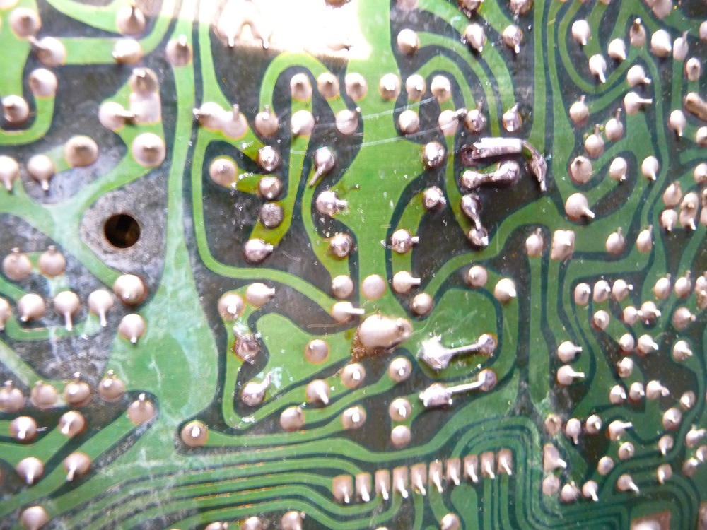 C'est tout d'abord la régulation des alimentations des étages d'entrée qui présente des anomalies. Deux condensateurs passablement décolorés démontrent un gros problème de surchauffe des transistors ballast. En y regardant de plus près, les soudures sont devenues cassantes, sèches, au point de fragiliser les pistes de la carte mère ... Remplacements, reprise de toutes les soudures, et les tensions redeviennent stables