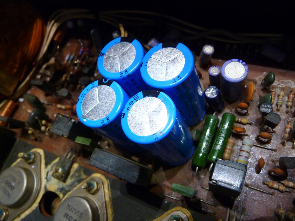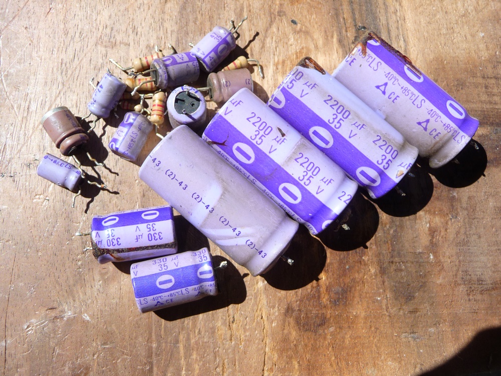 C'est ensuite le quad de condensateurs d'alimentation "puissance" qui se verra remplacé en raison du résidu de 100Hz persistant . Normal . Enfin, plusieurs résistances marquées par une dissipation excessive - sous-dimensionnement - seront également regonflées à neuf .
