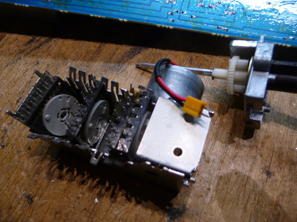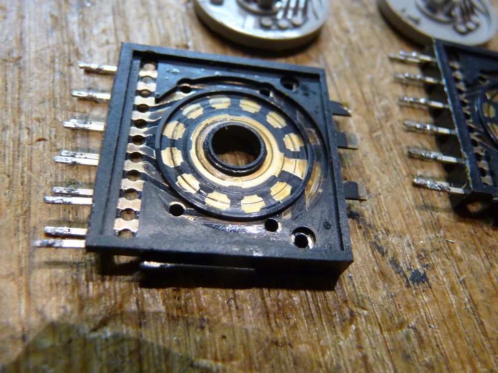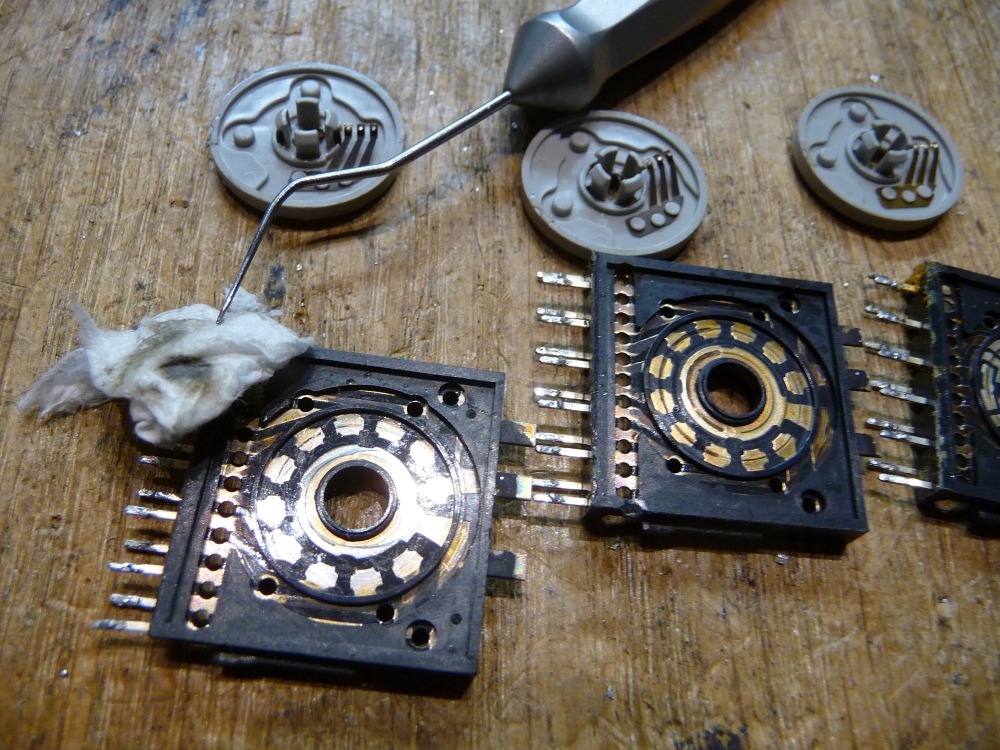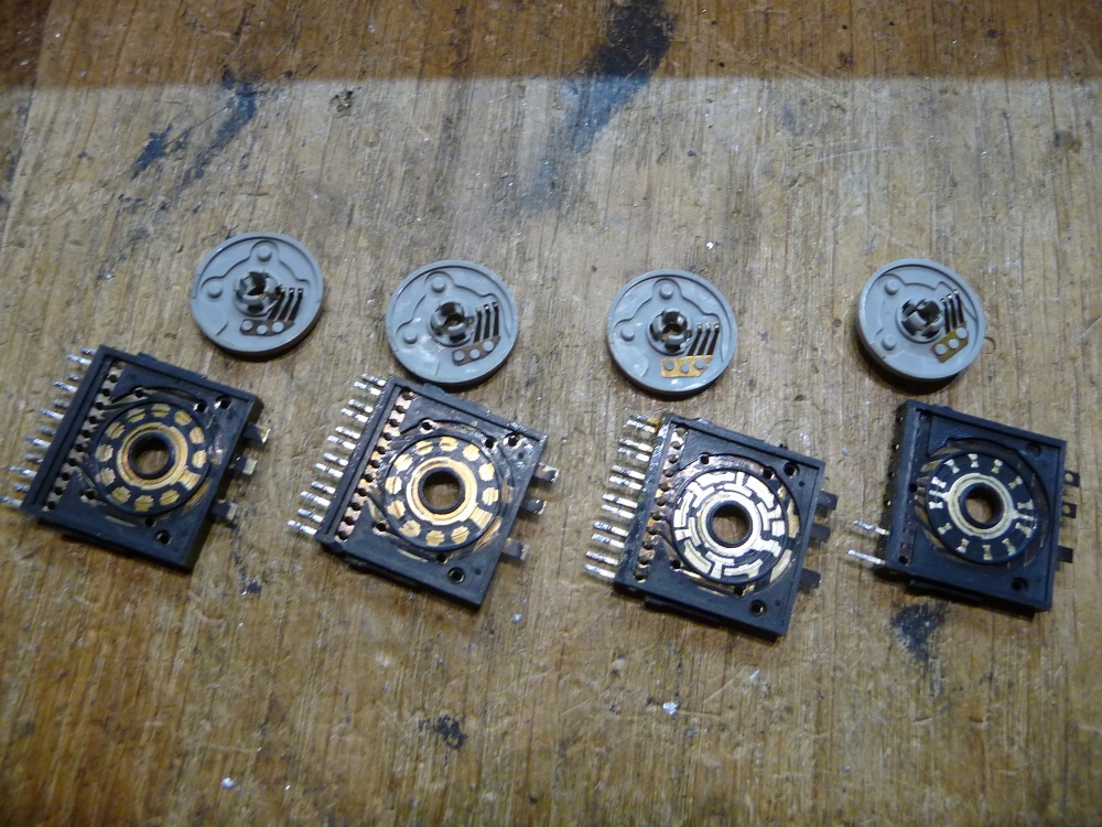 L'option "motorisation" télécommandée rend impossible l'accès au sélecteur, tout comme le sont les balais de contact - minuscules - protégés par leur flasque de support rotatif quasi étanche. Il faut se résoudre à mettre à plat le système, le traiter, et le remonter ... plus de trois heures seront nécessaires. Les galettes source D et G sont complétées de l'encodage du microcontrôleur de moteur et de la commande d'éclairage de la LED rétroéclairante...