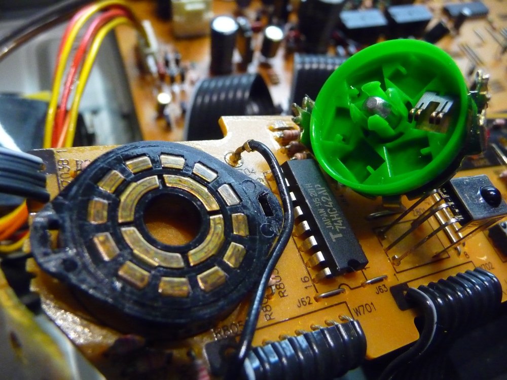 Après dépose de la carte de face avant, deux agrafes métalliques libèrent le tambour du contacteur mobile (la pièce verte ) situé à l'aplomb de la zone des contacts (de couleur noire) . Un vigoureux décapage à la cellulose retire tout un agglomérat d'oxydes.. et on remonte .