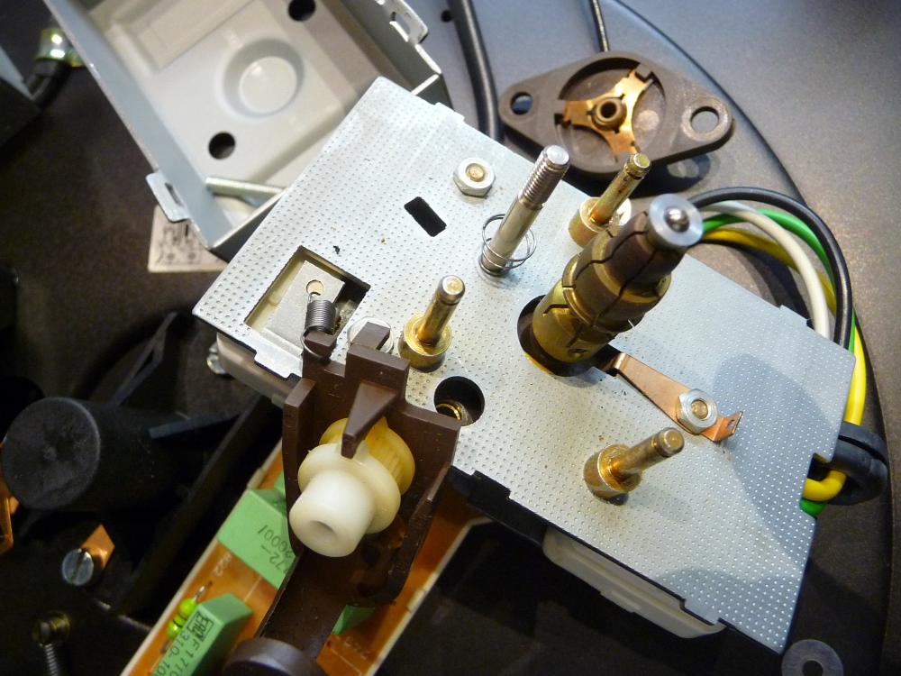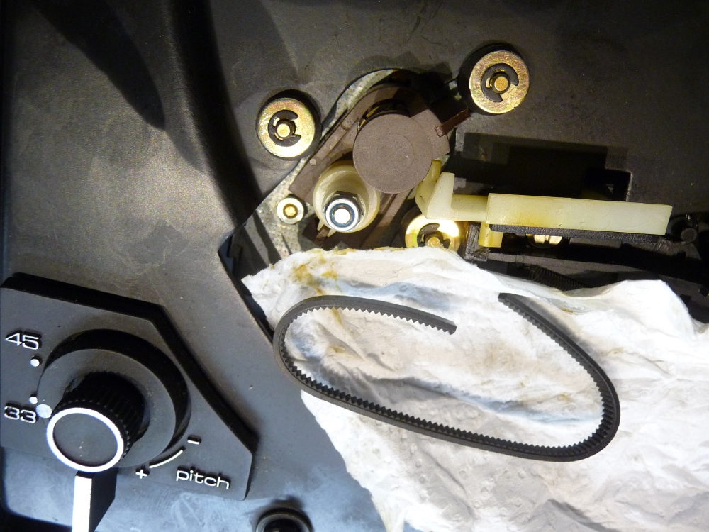 Modèle tardif, à entraînement par courroie, simple et accessible; Malgré un remplacement à neuf de la courroie justement, celle-ci refuse de démarrer. Le moteur, entièrement démonté et lubrifié à neuf n'est pas en cause. C'est du côté de l'arrêt automatique que réside le problème. La graisse durcie fige tout mouvement d'un basculeur de fin de lecture ...