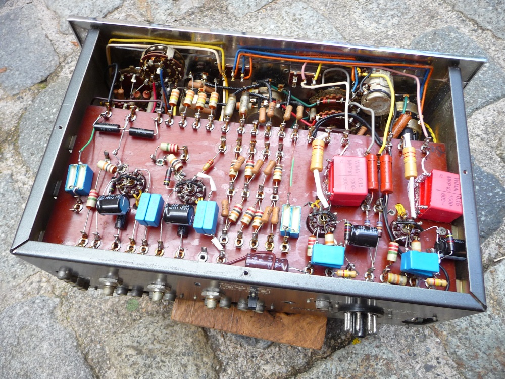 Le chantier débute avec la suppression de tous les condensateurs de liaison et découplage des G2 des EF86 au papier huilé "TCC", l'expérience nous a montré, à plusieurs reprises, que les courants de fuite (chez LEAK!) étaient trop erratiques pour assurer un fonctionnement durable sans défaut. C'est dommage, les armatures massives et mécaniquement amorties se révèlent très supérieures aux fabrications contemporaines. A une exception près avec WIMA , le seul fabricant à même de proposer des condensateurs à film polypropylène et armatures épaisses sous très haute tension (série FKP). Pour des raisons budgétaires, il sera mis en oeuvre des MKP, mais sous 1kV d'isolation.