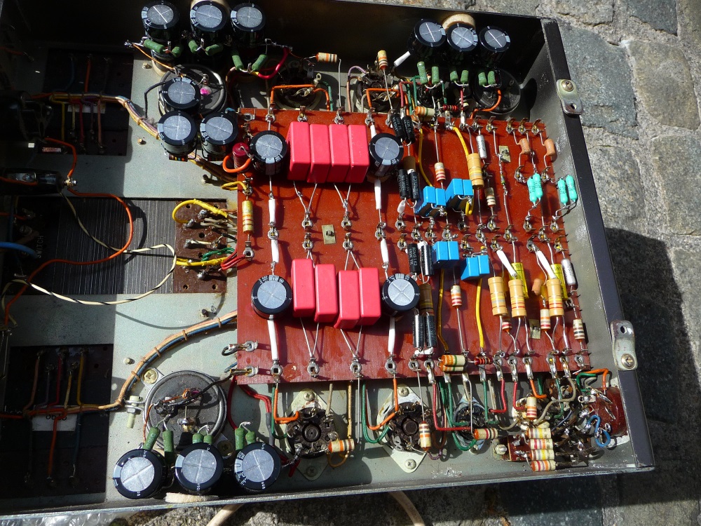 En ce qui concerne les condensateurs d'alimentation - HAUTE TENSION - avec près de 450V, les composants originels , très mal en point, au format gigantesque seront conservés à leur place, dans le seul but de ne pas attenter à l'intégrité esthétique de l'ensemble, mais après avoir été neutralisés. Nous leur substituons des capacités 105°C assemblées en série, mais sous le châssis, de manière à les éloigner des sources de chaleur...