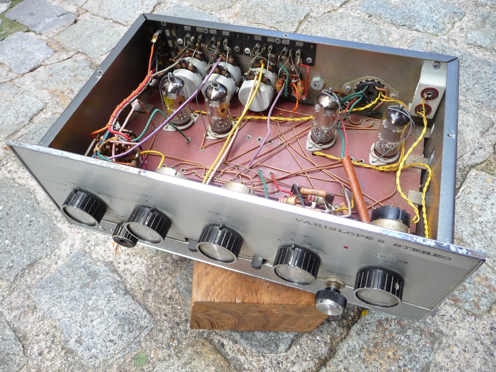 analyseur de tubes. Fort heureusement, à part un ergot détrompeur cassé, les tubes de sorties - les plus coûteux - se révèlent en très bon état, et pour trois d'entre eux, sans doute d'origine! La valve redresseuse n'est pas neuve, un peu fatiguée, mais est encore à même d'atteindre 360V (petite perte de puissance). Un remplacement sera quand même à envisager . Les quatre EF 86 du préampli se révèlent également en très bon état, estampillées MULLARD (mais production Philips) , en tous cas, d'origine . Il manque deux des trois ECC83, nous en fournirons une paire de chez RCA , occasions testées bien sûr.