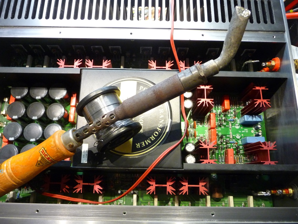 Lourds comme des enclumes, avec près de 35Kg , et donc difficiles à déplacer, ces appareils ne sont pas évidents à dépanner, surtout du fait de leur mécanique complexe à désassembler.On commence par retirer les couvercles (déjà 24 vis) , une partie de l'intérieur apparaît . Mais pas tout , les étages entrée et régulation entrée sont superposés et ne permettent d'accéder qu'à une face seulement des cartes. IL faut donc retirer le panneau arrière, ce qui est d'autant moins évident que les borniers (100A de capacité ?) sont soudés sur des sections de cuivre assez inhabituelles. Le symptôme annoncé justifiant cette opération est "manque de gain sur une voie"...