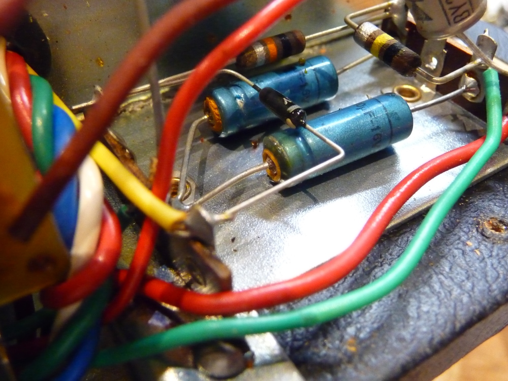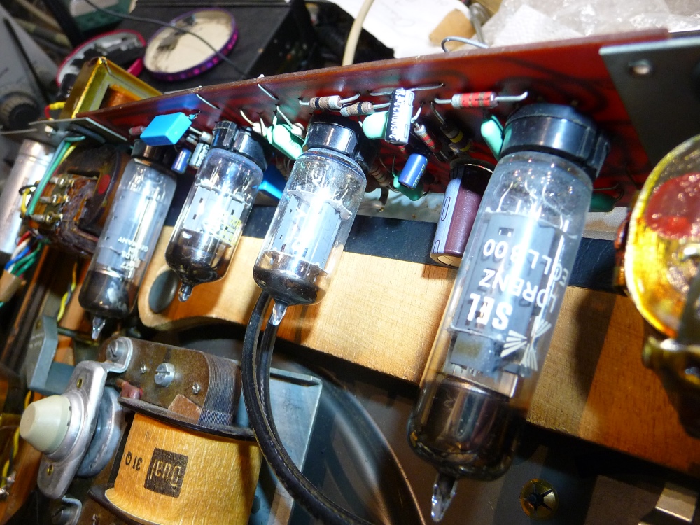 La rénovation de l'ampli était incomplète, les capacités haute tension originelles étaient toujours en service, ce qui n'est pas très sécurisant. C'est chose faite maintenant. Les tubes de sortie, ultra-rares, deux ECLL800 montés en push-pull , produisent 3W environ. Ils devraient pouvoir encore fonctionner plusieurs années étant donné l'absence de mauvais traitements sur le circuit imprimé ...