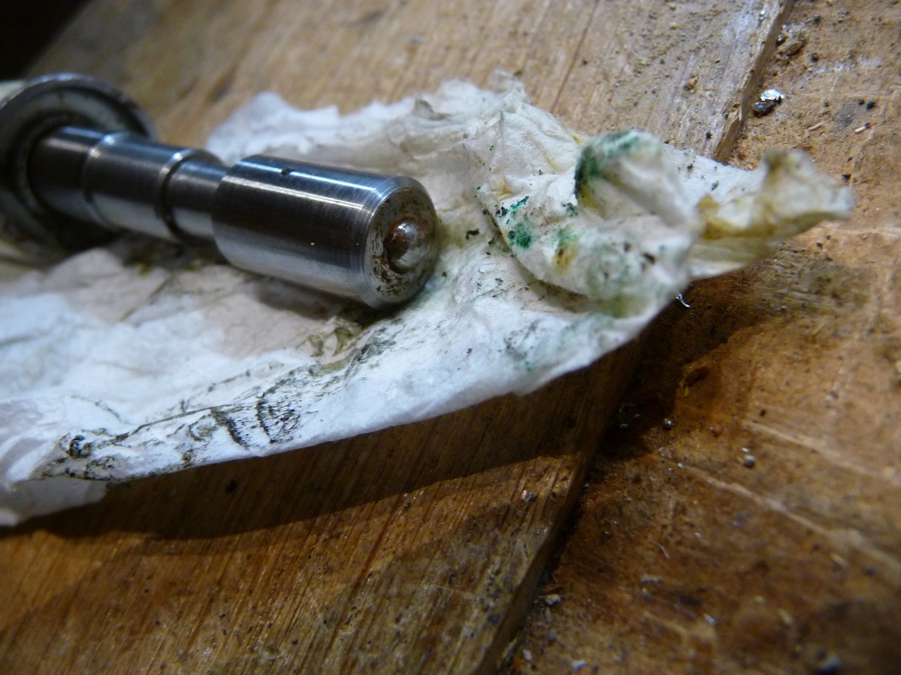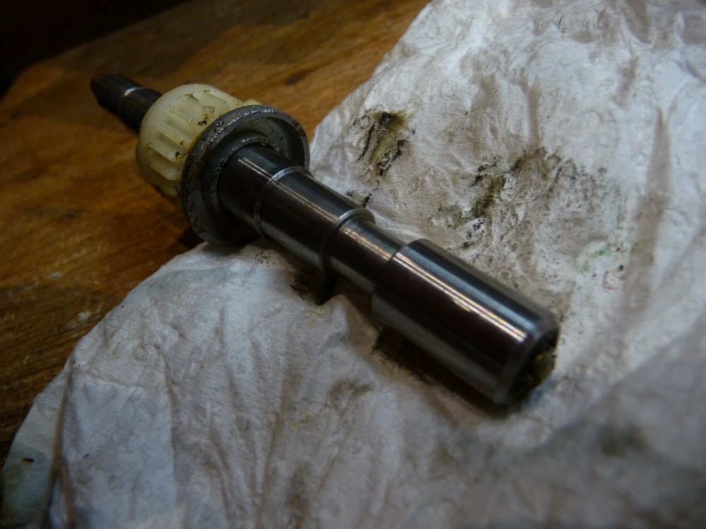 Totalement bloquée. Un cas jamais rencontré. Le pivot est quasiment immobilisé, très difficile à manoeuvrer . Il faut tout mettre à plat à l'issue d'une infiltration à l'acétone. L'huile a durci, séché, chargée en limaille, mais c'est surtout la bille de la base qui s'est oxydée au contact du palier en bronze. Le moteur nécessite également une lubrification à neuf, tout comme l'ensemble de l'automatisme figé dans une gangue de graisse que l'acétone seule parvient à dissoudre.